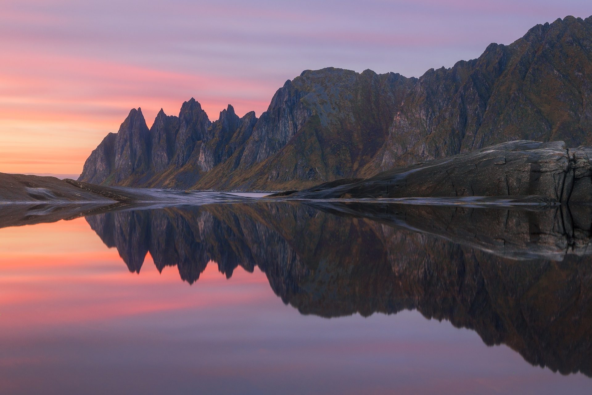Lofoten. With ripples the mid-ground, I photographed from ground level to minimize the appearance of mid-ground.